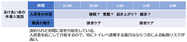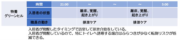 - 入居者様が覚醒したタイミングで訪室することで、誘導や排泄介助がしやすくなった