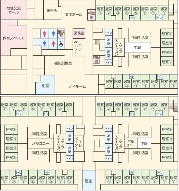 2018年に開設した定員60名のユニット型施設で、1階に2ユニット20名、2階に4ユニット40名が生活している。