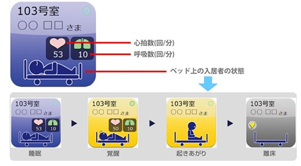 入居者様が覚醒・起き上がり・離床されたタイミングで、それらの端末に入居者様ごとにあらかじめ設定した画面表示や 通知が届くように設定しています。
