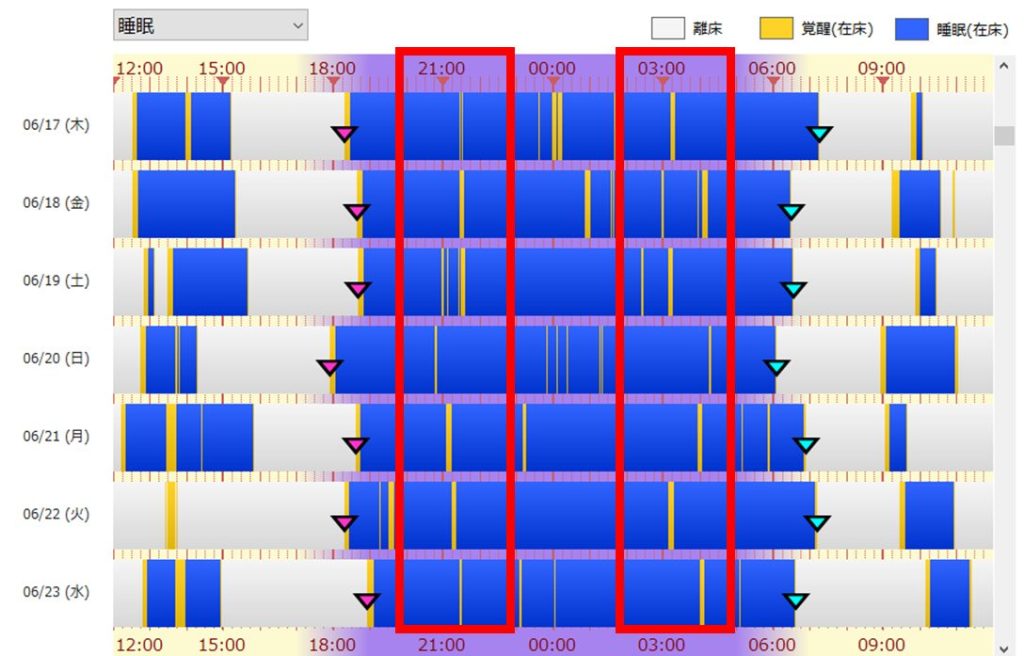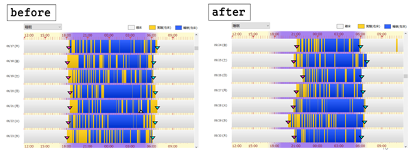 このケースでは、睡眠日誌の分析により、入居当初は夕食後すぐに就床されていた入居者様が、就床直後や朝方に覚醒状態にあることが多いことが確認できました。