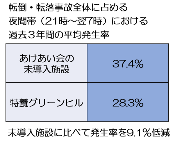 実際に、当施設における、過去3年間の夜間帯(21時から翌朝7時)に発生した転倒・転落事故の平均発生率は、当法人の見守り支援システム 未導入施設に比べて9.1%低くなっています。