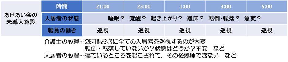 当法人の見守り支援システム 未導入施設においては、職員と入居者様双方において夜間の負担が大きいという課題がありました。
